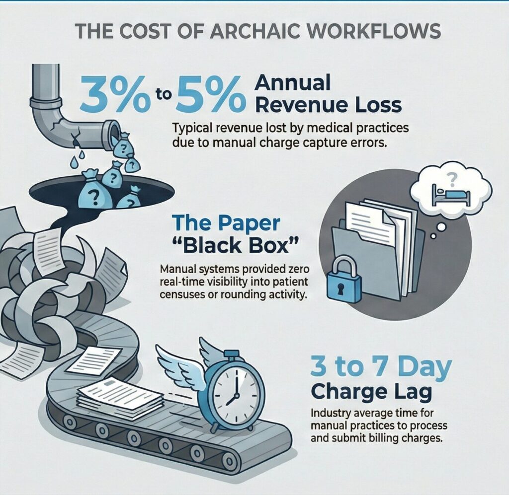 The practice has historically relied on a manual, paper-based system to capture charges. Old habits die hard with doctors typically batching their charges at the end of a long shift or wait until “office hours” at the end of the week to submit them. This process created a “black box” for the Revenue Cycle Management (RCM) team, who had no real-time visibility into patient censuses or daily rounding activity.